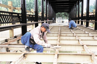 6月4日,在东沙河新建的风雨桥上工程人员正在紧张施工。风雨桥处于改造中的东沙河治理项目下游,龙头路和光明路之间,为木质结构,建成后将成为一处景观桥,可供市民休闲。 (记者 孙明春 摄)