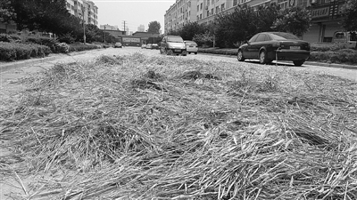 当天中午,记者沿西昌路进入该社区,在通往社区南大门的道路上看到,路面上铺满了干黄的麦秆。现场大致算了下,铺在路面上的麦秆面积长近50米,宽度约10米。麦秆堆中仅留下一条供行人过往的窄道,不少骑电动车的人行至此处,均缓缓地在窄道中骑行。车辆在麦秆上行驶,也放慢了速度。