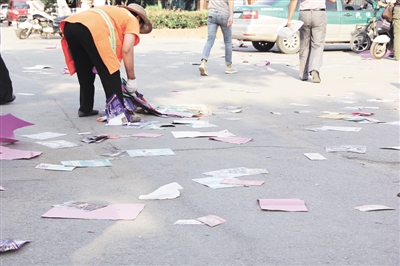 8日下午,十六中北校考点的考生们一出考场,发传单的人便一拥而上,不少考生和家长接过传单便随手丢掉。很快,各种传单撒落一地,环卫工人只能一张张捡拾。 (记者 李帅 摄)