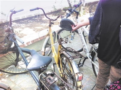 近日,记者在枣庄学院看到,由于校内院系较多,各个院系附近都有能够存放自行车的车棚。在一男生宿舍区门前,十几辆自行车存放在此,其中有四辆自行车早已锈迹斑斑、落满灰尘,还有两辆自行车已经解体,连座位和车轮都找不到了。在学校的其他几处公寓楼下,很多停在宿舍楼下及道路两侧的不少自行车已经生锈,轮胎也已经干瘪。