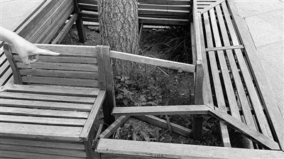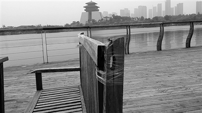 记者走访发现,在东湖公园,除了桌椅路灯外,还有不少角落也出现了人为破坏的痕迹。观光台附近,盲道上的鹅卵石缺失严重,路边青花瓷状的垃圾盖不知去向,通往湖心岛的木桥护栏上被刻字涂画。