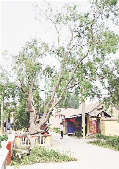 近日,受强对流天气影响,滕州市出现短时间阵风、雷雨和冰雹天气,最强风力为9级。记者在滨湖镇阳温东村村委会门口看到,一棵800年树龄的皂荚树树干倾斜,部分树枝被吹断。 (特约记者 王银 邵长富 摄)