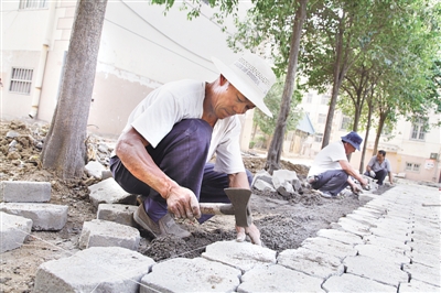 在滕州市荆善安居小区,工人师傅们正顶着大太阳在铺设花砖。尽管天气炎热,但工人师傅们仍坚守在自己的岗位上,按照既定规划进行老旧小区改造,力争早日完成改造任务,让老旧小区换新颜。