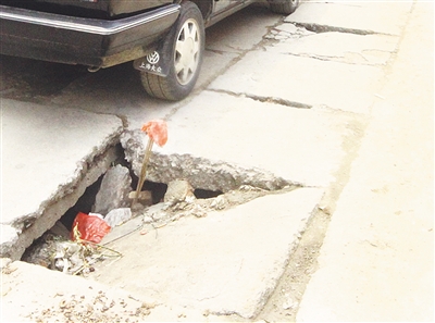 日前,记者在滕州市安居南路看到路中间一块水泥盖板已经坏了,在此路段有三处这样的盖板被损坏,据附近居民反映,这条路的盖板已经坏了很长时间了,没有人修,又没有路灯,晚上都不敢出门。为了不让行人、自行车陷进坑里,有好心人在坑边做了标记。 (特约记者 侯志龙 摄)