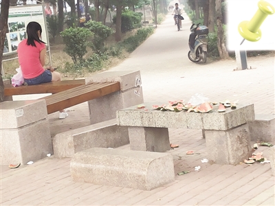17日,在市中区光明路和解放路十字路口西南角的休闲区,有纳凉的市民扔了许多西瓜皮,弄得休闲桌椅上都是黏糊糊的西瓜汁,让人看了很不愉快。 (记者 邵士营 摄)