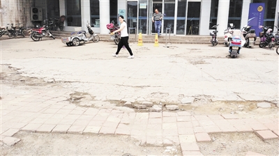 近日,有市民反映市中区青檀路和君山路交叉口的建设银行门前坑洼不平,地砖破损极为严重,很容易绊倒路人,同时也影响车辆停放,希望有关部门能尽快维修。 (特约记者 孙雯 摄)