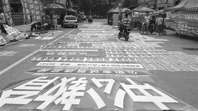 6月22日,立新小学考场门前几十米长的路面上,被一些公务员培训机构贴满了招生海报,像地毯一样,颇为“壮观”。一位市民说,招生贴海报无可厚非,可是将海报贴在学校门前的路上,实在是有种说不出来的感觉。另外还有人在路边的树上扯绳子悬挂海报,这种做法也欠妥。