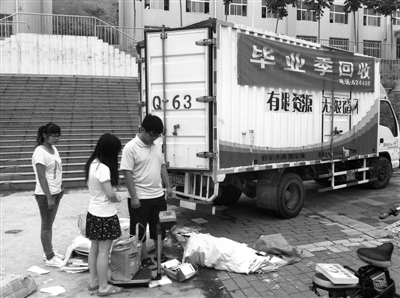 又到一年毕业季,在枣庄学院的一栋宿舍楼前停着一辆挂着“毕业季回收”条幅的回收车。有不少毕业大学生将大学四年来“带不走”或者 “用不着”的教科书以4毛钱一斤的价格当作“废品”卖掉。