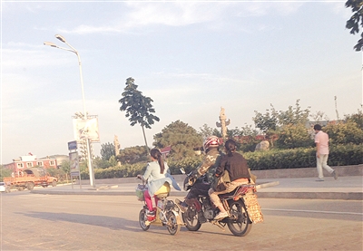 近日,山亭区北留路上,一个骑摩托车的中年男子用脚蹬着前面女子的电动车,旨在“助力”,但路过的市民却替他们捏了一把汗。