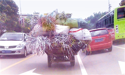 日前,记者在滕州市学院中路看到一辆拉东西的车“张牙舞爪”行驶着,路人纷纷避让。