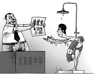 在辽宁省本溪市高级中学今年的1000多名高考生中,获得体优生加分者高达87人,近10%的高比例,受到众多考生和学生家长的质疑。有家长表示,“本溪高中连游泳池都没有,竟然有25名游泳二级运动员?”同时,鞍山一中、辽河油田高级中学分别有43名和40名高考体优生获得加分,也受到了质疑。(《新闻晨报》6月30日)