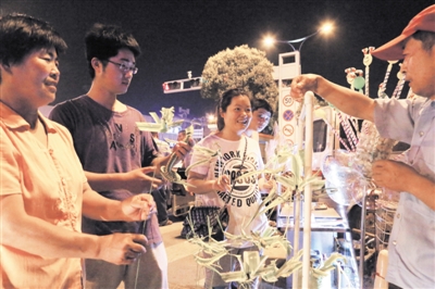 7月9日,在光明广场夜市一家摊位售卖的手工编织品引来不少纳凉市民驻足观看,这些手工编织的眼镜蛇和孔雀栩栩如生。