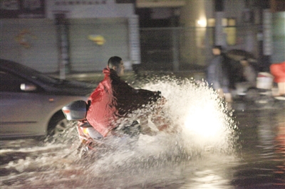昨晚, 一场大雨不期而至,不仅一扫高温闷热,而且也缓解了持续多日的旱情。图为在振兴路翡翠城路段,市民涉水前行。
