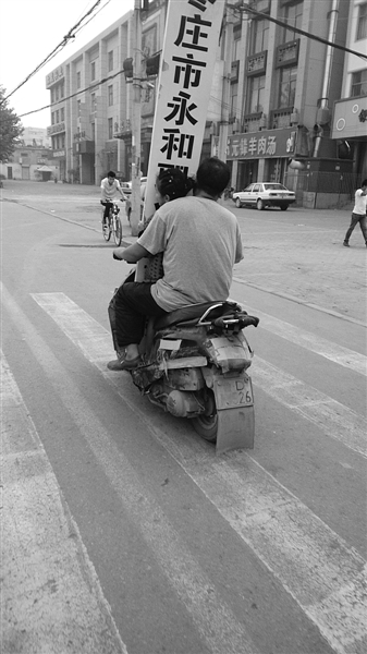 近日,在市中区华山北路,一男子骑摩托车带着一块木牌子,车小牌子大,晃晃悠悠,很是令人担心。而摩托车的踏板上竟还站着一个三四岁的孩子,和牌子挤在一起,稍不留神就会出危险。 (记者 孔浩 摄)
