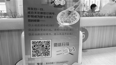 20日,记者在市中区多家大型超市、饭店发现,“微”促销在日常生活中可谓是无处不在。在市中区建华西路上的一家大型商场内,多个商家都有类似于“关注微信号送好礼啦”、“夏日激情福利,只需关注微信号”等宣传标语。而在市中区君山路上的一家水饺店内,在餐桌上也有“扫描二维码关注微信号”的宣传牌。
