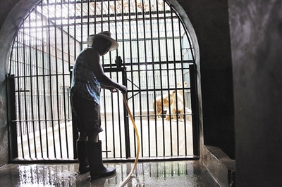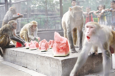 8点30分左右,动物的笼舍消毒完毕并被打扫得干干净净,9点多钟动物开始进餐,之后,火辣的阳光已照射进来,这时的工作人员便开始对部分不耐热动物的笼舍进行人工降雨,有的动物开始吃起了西瓜。