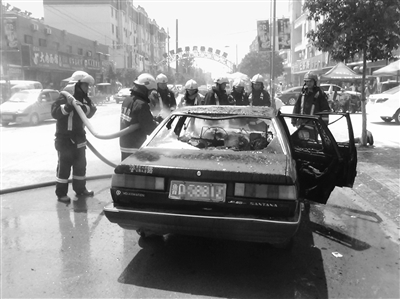 7月22日中午时分,薛城区海河路一辆机动车发生自燃,消防官兵及时到达现场进行了救援。 (记者 杨舒 摄)