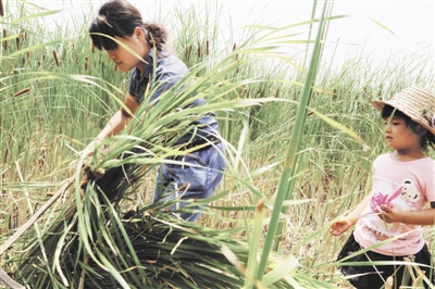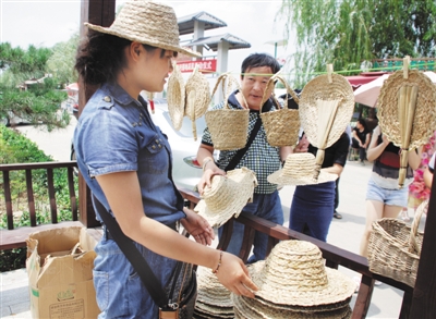 在运河湿地公园景区内的蒲草编织品,吸引了许多游客前来购买。一位来自上海的游客买了两个帽子,她说:“蒲草帽子富有较高的艺术欣赏性,其制品以朴实、典雅而深受喜爱,蒲草编织的帽子任性好、拉力强、耐磨、耐压带着方便。”来自青岛的李先生买了5双草鞋,他认为草鞋具有蓬松保温的特点,在家里穿既环保又舒适。