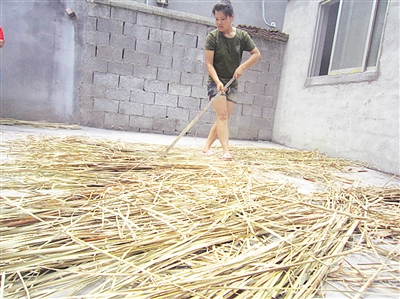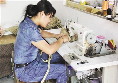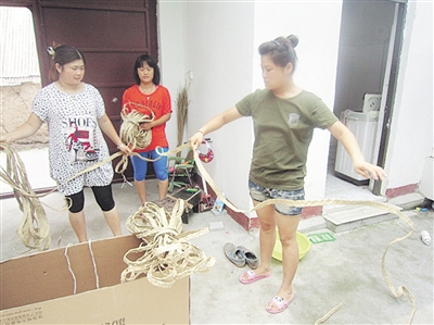 在张桂兰大娘的家中,有五六个妇女围坐在一起,她们正上下翻飞地舞动蒲草。今年77岁的张桂兰大娘每天编织蒲草辫60多米,收入30多元。张桂兰说:“以前,农村妇女在农闲时没什么事可做,现在好了,家家户户搞编织,不出门就能挣钱。”今年68岁的张美珍老人正在编织草鞋,厚实的鞋底,精巧的手工,一双用蒲草编织的草鞋格外精致。