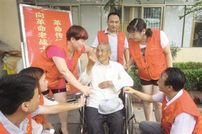 7月26日,枣庄义工联盟滕州分会的义工赶在“八一”前夕,购买了西瓜、香蕉等水果,到滕州市光荣院看望了92岁高龄的冯玉荣等退伍军人,听老人们讲述了战争时期的往事。 (特约记者 侯志龙 摄)