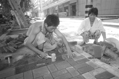 7月22日,在滕州市善国北路与学院中路交叉口处,一个光着膀子、汗流浃背的泥瓦工顶着炎炎烈日,正在砌地砖,他的名字叫张令友。