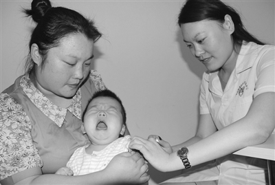 7月28日,台儿庄区运河街道接种服务中心内,医务人员正在给一名婴儿接种疫苗。当日是第四个“世界肝炎日”,宣传主题为“战胜肝炎,从我做起”,号召大家通过接种疫苗、早期筛查和规范治疗等措施,战胜病毒性肝炎。