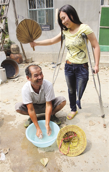 潇洒说,她两岁的时候,跟着爸爸妈妈出门,一辆大货车夺去了母亲的左脚和她的左腿,肇事者逃逸。那时她还小,也没觉得自己和别的小朋友有什么不同,因为她到哪儿都有父亲抱着。直到四五岁时,她才开始扶着床边练习走路,虽然只有一条腿,但她练得很用功,扶着东西可以边跳边走,还很轻快。