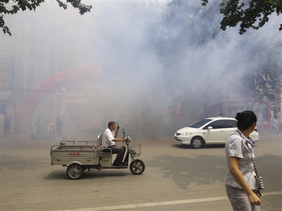 7月28日,君山路附近一家商店开业燃放了大量鞭炮,使得附近城区顿成“雾都”,来往车辆行人只好停下避让。