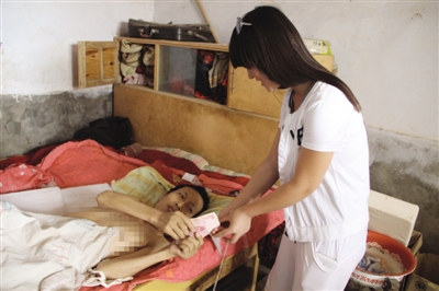 山亭区冯卯镇温庄村44岁的村民张忠明,因工作意外导致高位截瘫,目前已花医疗费几十万元,找不到老板,他只能四处借钱。7月18日上午,山亭义工协会两名义工来看望慰问张忠明,并把市爱心联合会委托的1000元善款交给了他。 (记者 焦兴田 特约记者 赵怀朴 摄)