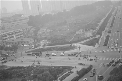 图中的画面位于滕州市龙泉街道境内,滕州市主要道路解放路、塔寺路在此交会,每天车流不息,甚是繁忙。就在此东面不远,就是滕州市著名的解放路斜拉索大桥。“这段多了说有百八米长的黄土路,存在好久了,晴天尘土飞扬,雨天泥泞难行,不明白,这段黄土路,为什么就是不修?”6日早晨,在熙熙攘攘的人流中,接受采访的几位市民对此颇有怨言。 (记者 焦兴田 摄)