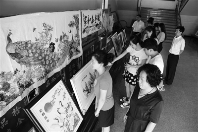 8月16日,市公交公司员工在观看十字绣作品展。为了丰富女驾驶员的业余生活,市公交总公司举行了首届女驾驶员十字绣大赛,女驾驶员在干好本职工作的同时,利用业余时间飞针走线,创作了50多幅精美的十字绣作品,表现了女驾驶员对美好生活的热爱。