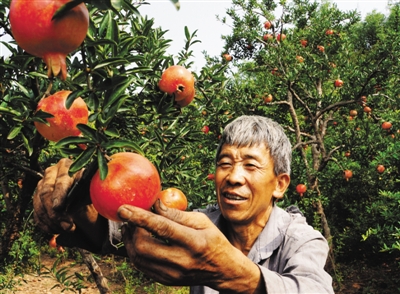 8月20日,山亭区北庄镇洪门村的科技带头人王祥刚正在采摘大红石榴。上世纪80年代,他种葡萄带出了鲁南第一葡萄村、国家级生态家园示范村。现在,他种植的200余棵大红石榴已进入盛果期,当年的“葡萄大王”变成了名副其实的“石榴大王”。 (记者 孙明春 通讯员 赵连友 摄)