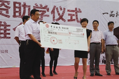 8月30日,在峄城区坛山文化广场上,枣庄一品梧墅置业有限公司为峄城匡衡小学捐资10万元,用以即将建设的塑胶跑道、图书室、多功能阅览室、师生餐厅等。 (记者 王震 摄)