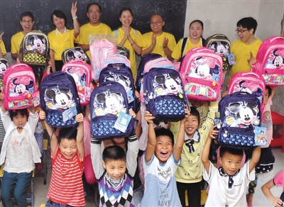 图② 学生们展示收到的新书包。昨日,在湖北偏远的大别山区英山县石头咀镇,饼铺小学的41名学生迎来开学第一天。饼铺小学在校学生55名,70%的学生是留守儿童。武汉e缕阳光爱心公益和武汉点滴公益的志愿者们为这些孩子募集到新书包、文具等学习用品60多套,并和孩子们做游戏、绘画,实现他们“新学年、新书包、新朋友”的小愿望。