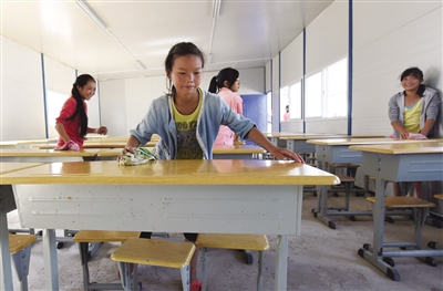 图③ 昨日,几名学生在龙头山镇的龙泉中学临时活动板房学校的教室内打扫卫生。云南鲁甸6.5级地震造成当地大量学校教室、宿舍受损,无法正常使用。为确保地震灾区学校9月1日开学,当地搭建了231所板房学校(含幼儿园),这些板房学校于昨日交付使用,确保灾区所有学校按期正常开学。