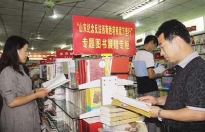 9月3日,是首个“中国人民抗日战争胜利纪念日”,也是世界纪念反法西斯战争胜利69周年。台儿庄区新华书店设置了“山东纪念反法西斯战争胜利阅读万里行”专题图书展销专柜,放置了各类“抗战红色书籍”近百个品种、2000余册,方便了市民阅读和购买。