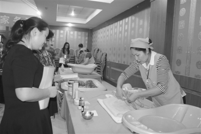 9月2日,滕州市第九届职工技能大赛首届母婴护理技能比赛举行,4名母婴护理人员正有条不紊地给婴儿模具洗澡护理,还有2名专业评委进行现场打分。