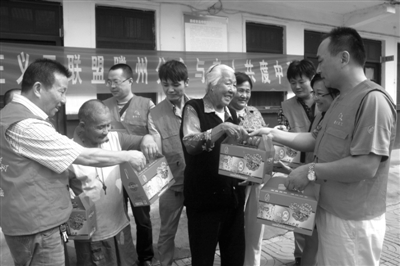9月3日,枣庄义工联盟滕州分会的义工杨士燕、张明、张琴、黄天、单来发、刘敏为滕州市北辛敬老院的老人送去了月饼、水果等礼品和节日祝福,并和老人们一起提前过了个中秋节。 (特约记者 侯志龙 摄)