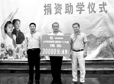 9月2日上午,山亭区西集镇中心小学举行“捐资助学”仪式。捐赠仪式上,山东贵诚集团德国西门子电器向该校捐赠了100余套课桌椅,总计达3万余元。此举极大改善了该校的办学条件,为学生们创造了良好的学习环境。 (记者 苏羽 摄)