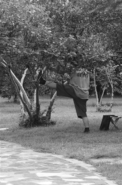 在市中区光明广场的小树林里一位市民把腿压在树枝上锻炼身体。路过的市民表示,这样锻炼不文明,也破坏了广场优美的环境。