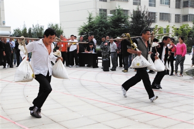 9月19日,山亭区第四届全民健身运动会暨第一届农民趣味运动会在北庄镇举行。来自全区10支代表队的120多名运动员参加了趣味投球、拔河、抢凳子、挑粮食等比赛,这些运动形式深受农民的喜爱。 (记者 孙明春 摄)