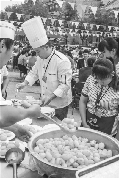 10月4日,在滕州微山湖古镇,厨师在为游客准备土豆盛宴。当日,微山湖古镇将本土土豆与长街宴相结合,打造首届微山湖古镇千人土豆宴,游客在欣赏动人的歌声和优美的舞蹈中,尽情品味土豆的香甜。