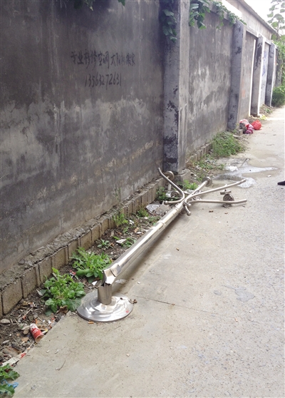 随后,一位男子带记者来到小区的最北边,只见这里的围墙已经严重倾斜,围墙和地面接触的地方有一条近两厘米宽的裂缝,围墙随时都有倒塌的危险。这位男子告诉记者,去年夏天,由于连降大雨,这段围墙有一部分已经倒塌了。当时正是早晨五六点钟,有两位住户的私家车就停在围墙边,围墙一倒塌不要紧,这两辆车可跟着遭了殃,车门、车顶都被砸坏了。“事后,大家都不敢靠近围墙走路了,也不敢把车停在附近了。你看这倾斜的围墙,今年多亏没下多少雨,要不然它也早就倒了。不仅是围墙,半个月前,我在楼下走着,突然听到身后有东西倒的响声,回头一看,才发现是路灯柱子横着倒在了地上,多亏我走得快,要不然得砸到我的身上。小区里有很多小孩,万一砸到孩子,那后果不堪设想。”该男子说道。记者看到,原本横在路上的灯柱已经被住户抬到路边,灯泡散落,电线裸露在外。一位抱着孩子的女士说,“现在薛城很多小区都在安装暖气,小区没有物业,我们不知道该向谁提出申请,就像是一群被遗忘的人们,感觉很无助。”