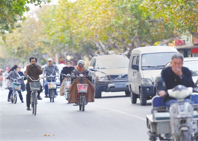 10月29日一大早,刚刚经过大幅降温的清晨显得异常寒冷。记者在市中区龙头路看到,骑电动车从此处经过的市民有相当一部分前面都反穿了一件厚厚的外套。在15分钟的时间里,大约有20余名反穿衣服的骑行者,他们绝大多数以女性为主,反穿的衣服也主要多为帆布或棉质等较挡风的厚衣服。不光如此,记者还发现此类衣物的里层多为绒制,摩擦力较大,这就使得手臂很难快速从袖子里抽出。龙头路整条路段均比较狭窄,早间时分车多人多,不少将衣服反穿在外的骑行者,很难像其他人那样能够比较轻松地回头察看侧后方车辆,有个别骑电动车的市民在向侧前方超车时,险些被后方的车辆顶到。