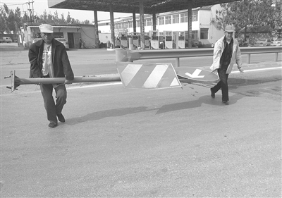 近日,在市中区西昌路与君山路路口向北不远处,两名环卫工联手将路中间一歪倒的道路指示牌抬至路旁。一名环卫工表示,他也不知牌子是何时歪倒的,只是怕影响车辆的行驶安全,所以就赶忙喊同事先把它抬到路边上。