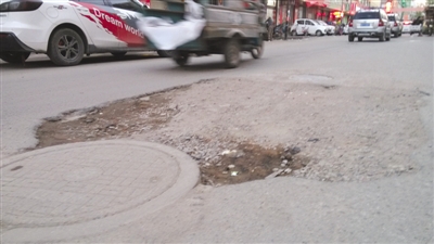近日,在市中区中天步行街北段,有一个长宽均约两米的大坑横在路中央,影响市民的正常通行。周围商户告诉记者,这个大坑形成有段时间了,希望有关部门能够及时进行维修。