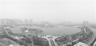 昨日上午,东湖公园笼罩在雾霾之下,外出的行人纷纷戴上口罩。当日,我市遭遇立冬后的首次雾霾天气,来自环保监测部门上午9时的数据显示,市区内的监测点都已经达到200以上重度污染指数,达到近几个月来的新高。 (记者 马高超 摄)