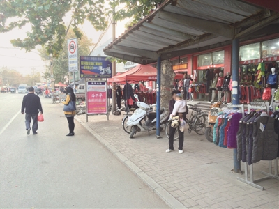 在市中区惠工八区附近的公交站台及站台旁的人行道被商贩占据,过往的市民只能绕道走在非机动车道上。“站台上摆满了衣服,乘客只能在马路上等车,太不安全了。”市民翟女士说。
