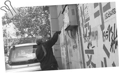 18日下午,一位老人正在市中区立新小区里清理贴在墙上的小广告。附近居民说,经常看到有人在清理小区的“牛皮癣”,他们没有统一的着装,也没有专业的工具,大多是小区里的热心居民,邻居们对此行为表示“点赞”。 (记者 刘豹 摄)