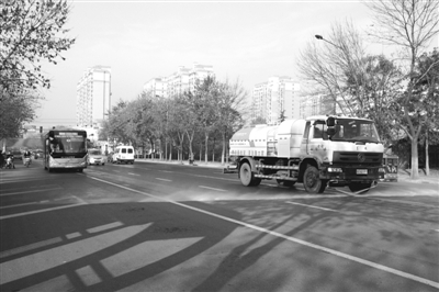 11月19日,洒水车在市中区文化路进行路面洒水。连日干燥带来颗粒扬尘,该区出动多台洒水车,对城市道路进行一天多次的密度洒水作业,抑制道路扬尘。